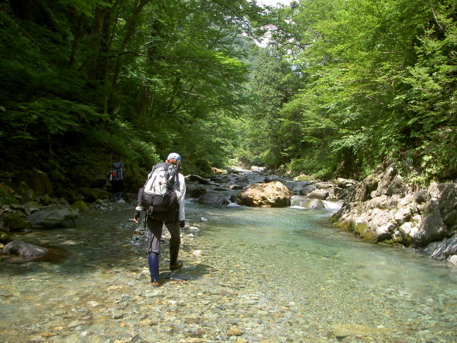野反湖から渋沢ダムまでのコースタイムは4時間。 初心者の敏子がいるが、登山道歩きなら特に問題ないだろう、と思ったのが最初の誤算だった。 登り主体の前半はまだ良かったのだが、最後のダムまで延々と続く下りに敏子が音を上げてしまった。 標高差600メートルを一気に下りるこの道は、「下りのスペシャリスト」を自称するこの私でも少々ウンザリするほどであった。 下りの苦手な敏子は、「ヒザが痛くてもう歩けない〜。」と泣きが入っている。 なんとかなだめすかしながら5時間かかって入渓点まで下りて来た。 敏子は半ばいじけている。 う〜ん困った・・・この辺りをベースに2日間を過ごす手もあるが、その場合帰りは今来た道を登り返さなくてはならない。 「登りのヘタリスト?」を自称する私とまにちゃんには、その選択は命取りだ。 まあ沢に入れば気分も変わるだろう、ということで遡行を開始することにした。