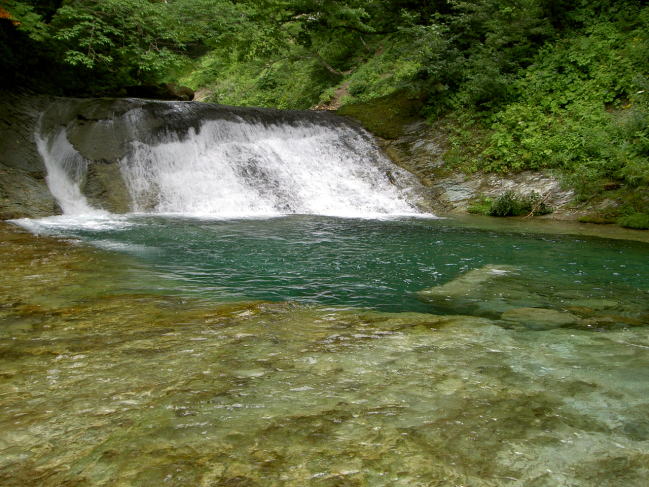 正面にカギトリゼンが現れた。 まにちゃんに向って右手を挙げて、「釣りしていいよ。」とサインを送る。 大きな滝壺から一発で良型が飛び出した。 この先はナメが続き、イワスゴゼン、スリバチゼン、ヘリトリゼンと美しい滝が次々と現れる。 魚野川最大のビューポイントだ。 いつか舐め・・・もといナメ好きの貝好さんを連れて来たいものだ。