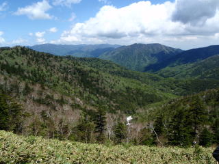 帰りは登山道でノッキリまで戻る計画だったが、疲れたので高天原スキー場のリフトで降りることにした。高山植物園を歩いていると数年前の出来事を思い出す。 木道で女子高生らしき4〜5人グループと「こんにちは〜!」とすれ違ったのだが、その直後に「自衛隊の人かな?」という彼女達の会話を聞いてしまったのだ。演習かなんかと勘違いしたのだろうか、お花畑の真ん中で、それほどまでに我々は浮いていたというのか・・・。