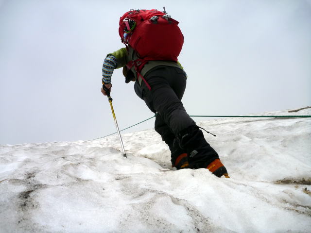 | 気を取り直して下って行くと、ほどなくして辺り一面真っ白な世界に飛び込む。どうやらここがオバサンの言ってた残雪箇所のようだ。軽アイゼンを装着し、地図と磁石で進むべき方向を照らし合わせながら進む。視界は10m先がやっと。しかし100mも進むと左下の土が露出した部分に登山道が顔を出した。それから5分ほど進み茂倉岳山頂に到着した。 | ||