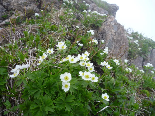 | ロープやクサリが架かったところを2、3ヵ所過ぎると「天狗のトマリ場」。振り返るといま歩いてきた天神尾根が気持ちよく伸びている。足元の高山植物に目をやりながら、引き続き歩きはじめる。 肩の小屋直下で残雪、相変わらずの「自分撮り」で何回撮り直したあと、100m幅ほどの残雪を進んでいくと肩の小屋に到着した。辺りは一面ガスの中、時間はちょうどお昼。小屋番の馬場さんから缶ビールを2本買い、板張りのとてもきれいな休憩室で昼食とする。 |