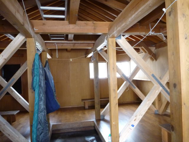 | 自分撮りをしながらの歩きは意外と時間がかかってしまうものだ。時計の針はなんと15時を大幅に回っている。土樽駅発の電車時刻は18時07分。このまま普通に歩いては電車に間に合わない。ここからはコースタイムを縮めてガンガン下って行くっきゃない! 茂倉新道を10分ほど下ると茂倉岳避難小屋。中は整理整頓がされておりチョーきれいでトイレも別棟。宴会山行でゆっくり泊まりたい小屋だ。写真を数枚とり、水場も確認しておきたかったが時間が惜しいので先を急ぐ。 |