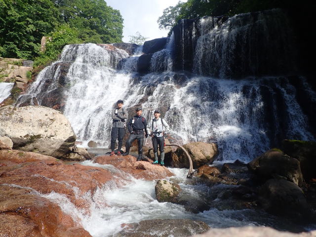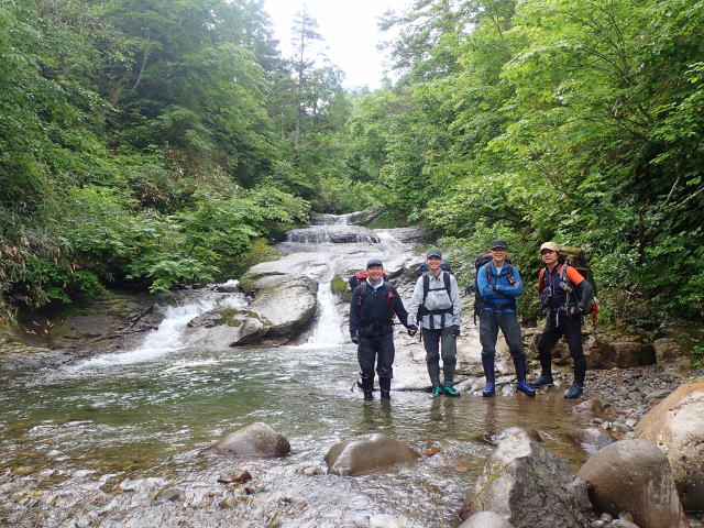 今回は11年前とは違うルートで詰めてみようということに。前回とはルートは違うが激烈な藪にハマった過去の話は何度も聞いているので、大丈夫大丈夫と言われても不安は拭えない。暫くはなんてことない沢歩きで景色を楽しむ余裕もあったがそれほど大きくはない2段の滝が現れた。巻くか右岸をへつるか泳ぐかで悩む。2度高巻きを試みるがどちらも険しいのでロープを出してへつることに。佐藤さんがサクッとリードしてくれた。
